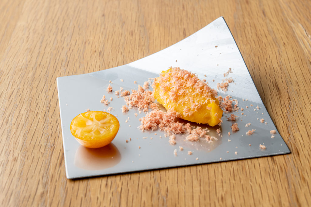 「ニンジンのスープ」を口に含むとニンジンの風味や香りが複合的に押し寄せ、イキイキとしたミネラル感や力強い旨味が味を支える。ニンジンのピューレに鶏のブロード(出汁)を加えて作っているのかと思いきや、「水とニンジン、少量の塩だけで作っています」とオーナーシェフの亀井俊一さん。ゲストが思わず「え!」と絶句したり「本当?」という声が挙がったりする光景は、この店では日常的だ。